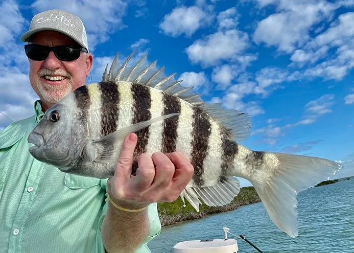 Sheepshead or the “Convict” known for its distinctive vertical black and white stripes are a reputed as a snobby fly eater, but will readily eat a live shrimp when given the chance. These tasty critters are a delicacy here in south Florida, and can be harvested.
